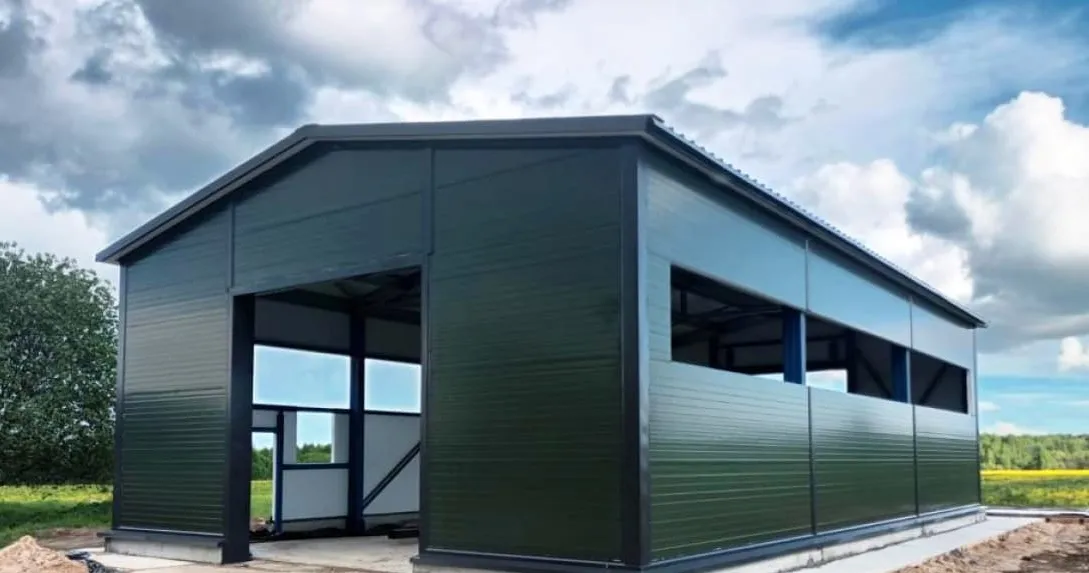 - монтаж каркаса, установка ворот, обшивка сэндвич‑панелями;